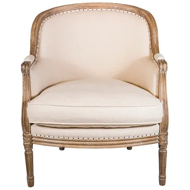 Description Louis XV style armchairs. Studded occasional chair in natural linen colour with exposed carved wood leg detailing. This chair makes a ...
