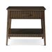 The Lido Nightstand V in Bistre by Theodore Alexander showcases a balance of sophistication and craftsmanship. This designer nightstand is crafted from rich Prima Vera wood in a deep Bistre finish, featuring a gracefully tapered silhouette and finely reeded drawer and shelf. Custom forged hardware in dark rubbed bronze echoes the textured detailing throughout, creating a refined designer bedside table that blends timeless design with modern elegance.