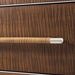 The Origins Nightstand II in Landmark by Theodore Alexander showcases elegant simplicity and refined craftsmanship. This designer nightstand features smooth, polished curves and is crafted from figured sycamore wood. A soft-close drawer and open cubby provide practical storage while maintaining a sleek silhouette, making it a sophisticated designer bedside table.